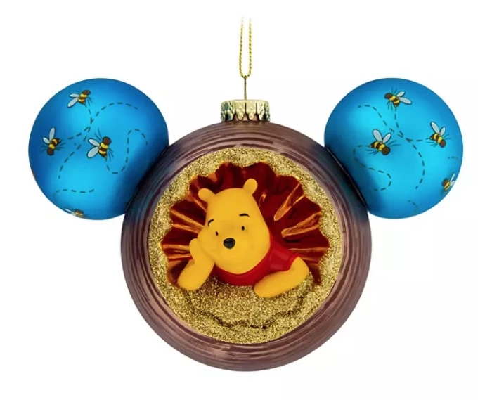 Fans of Winnie the Pooh will get a buzz from this ornament featuring bees swarming around the ears of the glass Mickey icon design. 3D figures of Pooh and his friend from the Hundred Acre Wood, Owl, are featured on either side of this elegant addition to your holiday decorations.